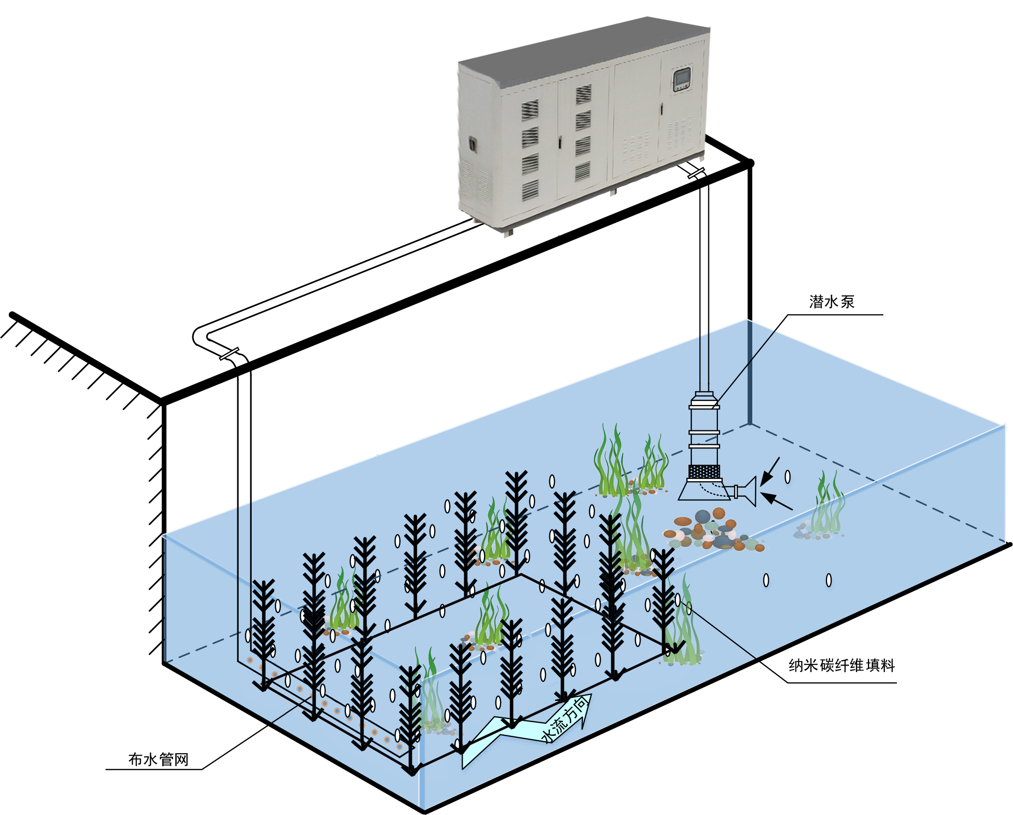 高效富氧生物技術結(jié)合納米碳纖維載體,為各種類型的微生物的高效繁殖提供有效的附著空間,快速形成生物膜。載體表面形成的生物膜以污水中的有機物為食料加以吸收、同化,高效生物浮床可以有效的發(fā)揮水生植物凈化與微生物高效降解水體中污染的功能,對水體中N、P具有較強的凈化作用。此技術適用于水流流速較大,水位較深的非行洪中小河流。