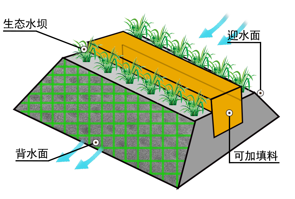 生態(tài)透水壩結(jié)合高效富氧生物技術,水中污染物在物理沉降、自然降解、水生生物吸收的作用下,凈化水質(zhì)。生態(tài)透水壩利用物理過濾、植物吸收和微生物降解。物理過濾在于堆積壩體的濾料之中形成許多空隙,污水在經(jīng)過生態(tài)透水壩時,水中的污染物被吸附和攔截下來。生態(tài)透水壩上種植的水生植物產(chǎn)生的大量根系深入壩體,吸收水中的營養(yǎng)鹽和重金屬。許多微生物和原生動物生長于濾料中,它們利用污水中的營養(yǎng)物質(zhì)生存和繁殖,進而凈化了水質(zhì)。適用于流速緩慢、污染嚴重的非行洪中小河流。
