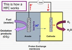燃料在細(xì)菌的催化作用下于陽極室被氧化,產(chǎn)生的電子通過位于細(xì)胞外摸的電子載體(例如,細(xì)胞色素)傳遞到陽極,再經(jīng)外電路到達(dá)陰極,質(zhì)子通過質(zhì)子交換膜到達(dá)陰極。氧化劑(一般為氧氣)在陰極室得到電子被還原。
